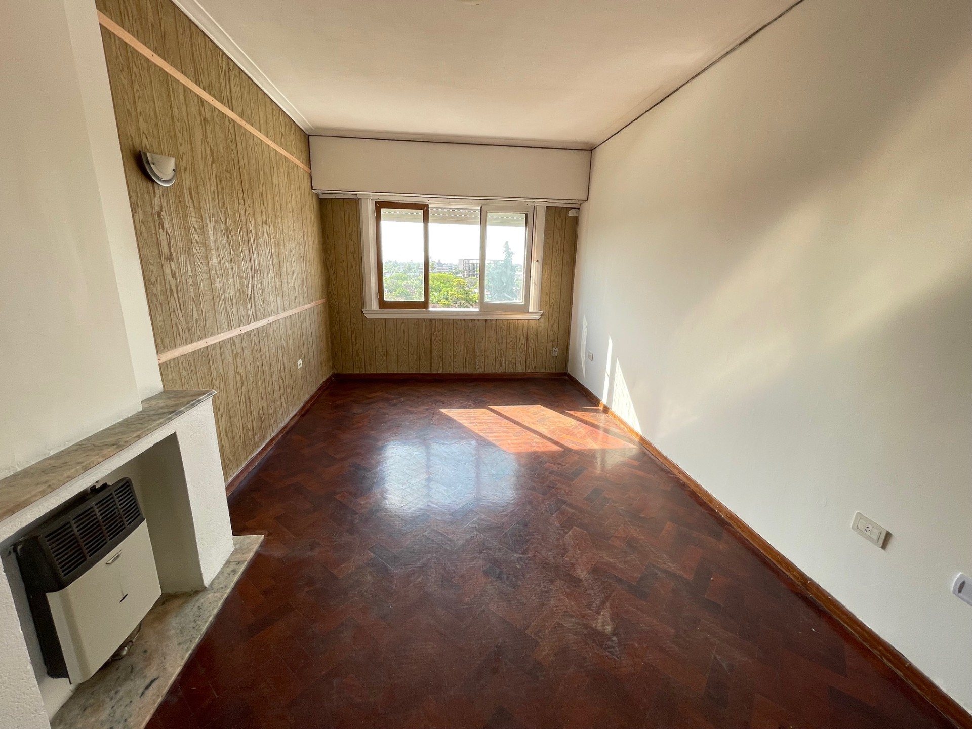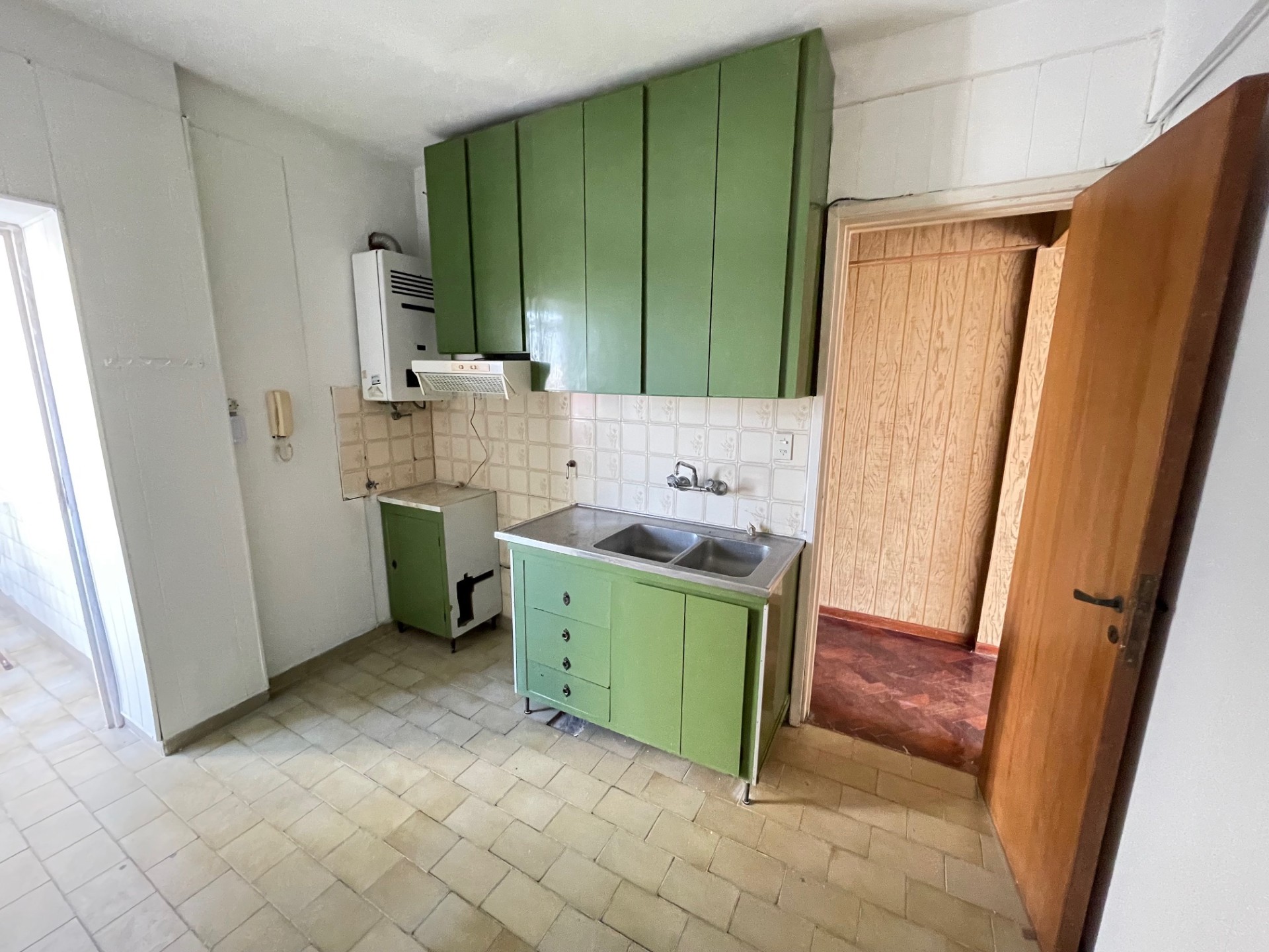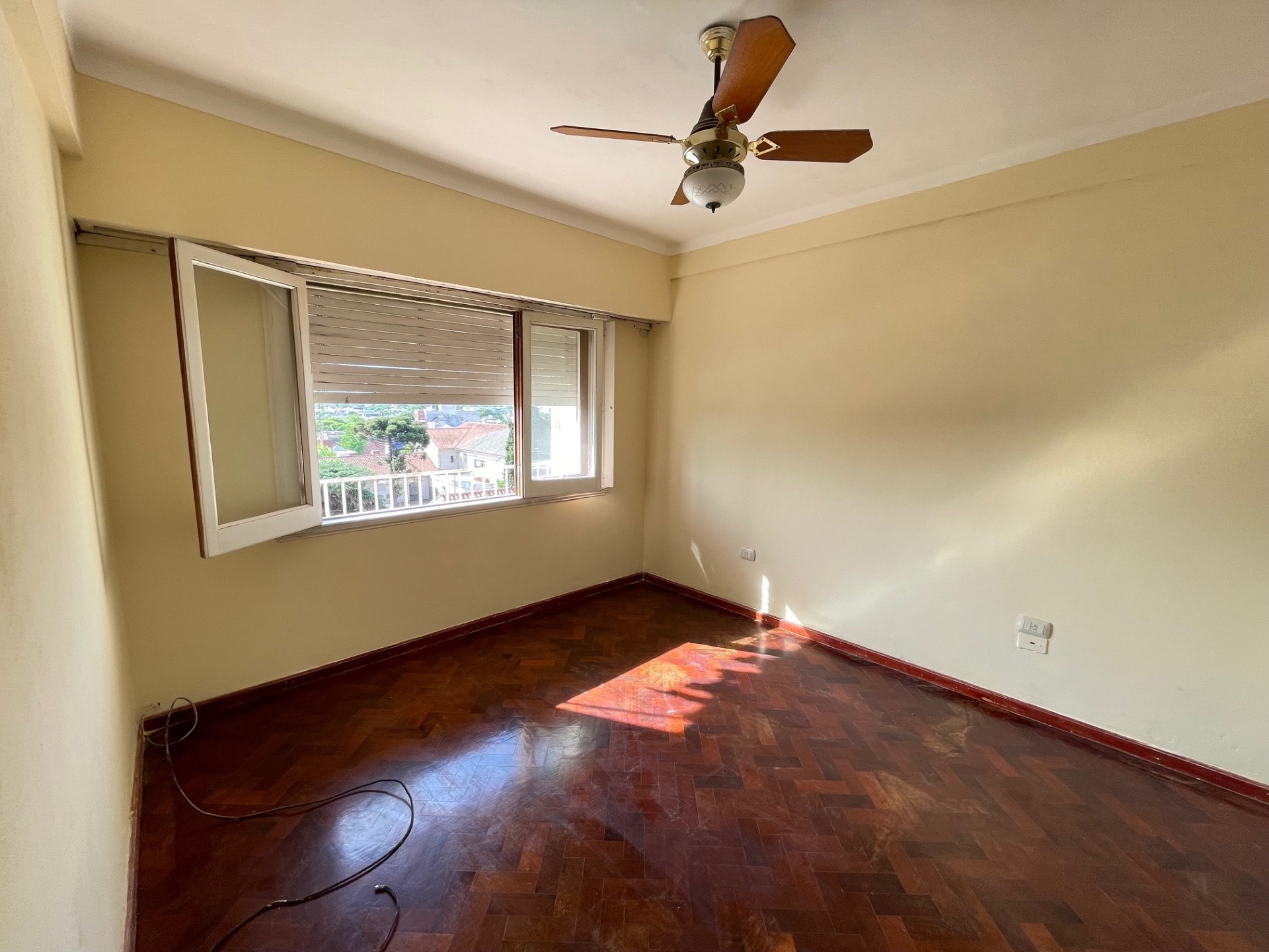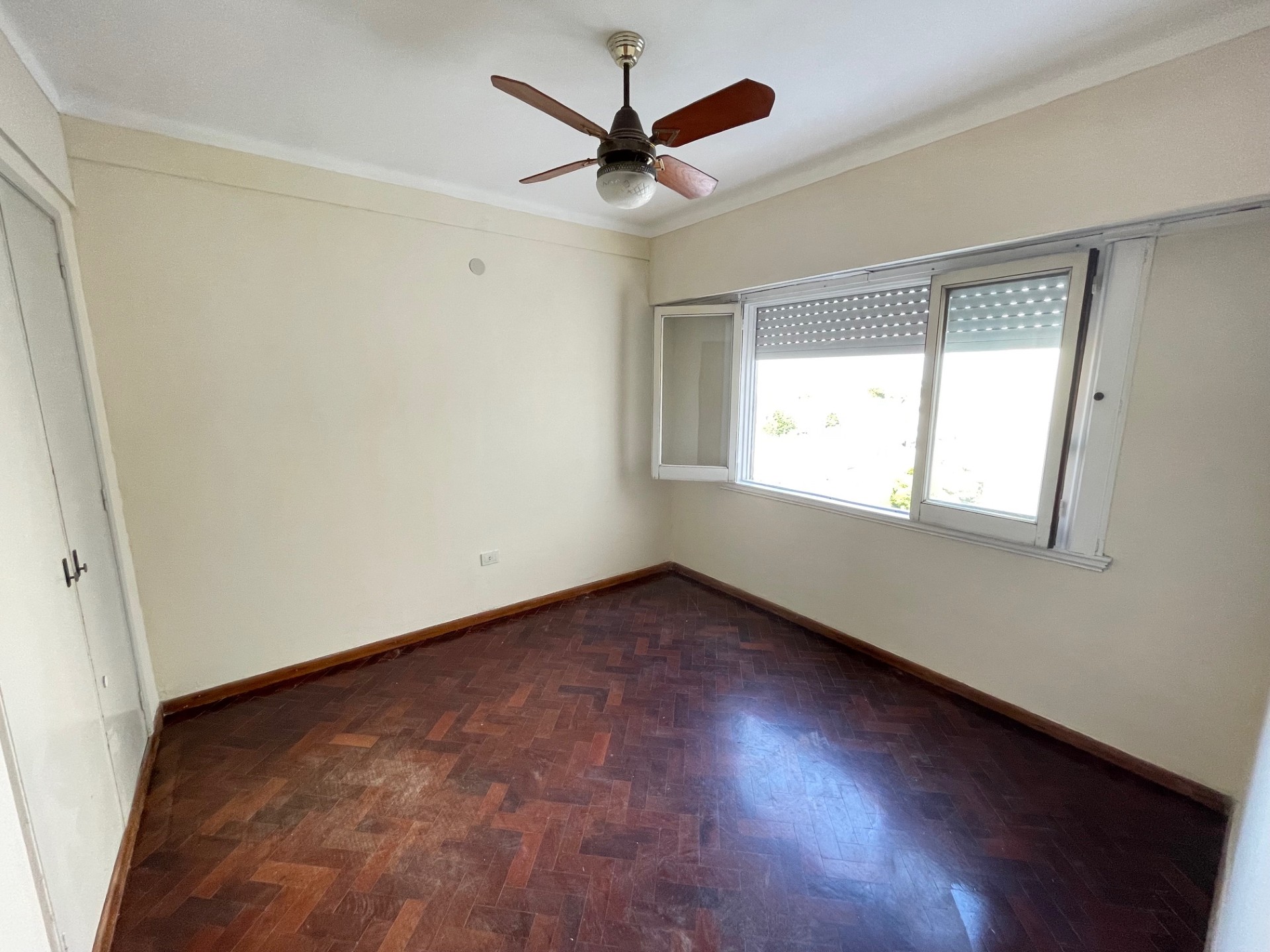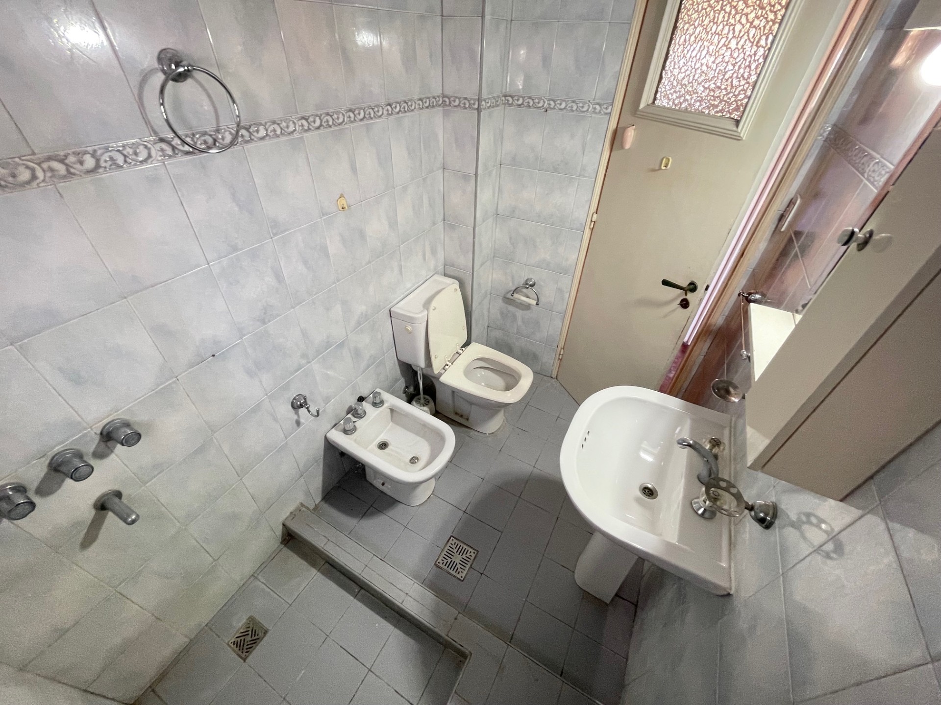 Departamento de tres dormitorios (uno pequeño) con placares, living comedor, cocina comedor (sin artefacto de cocina), baño, lavadero con baño de servicio y balcón al contra frente. -