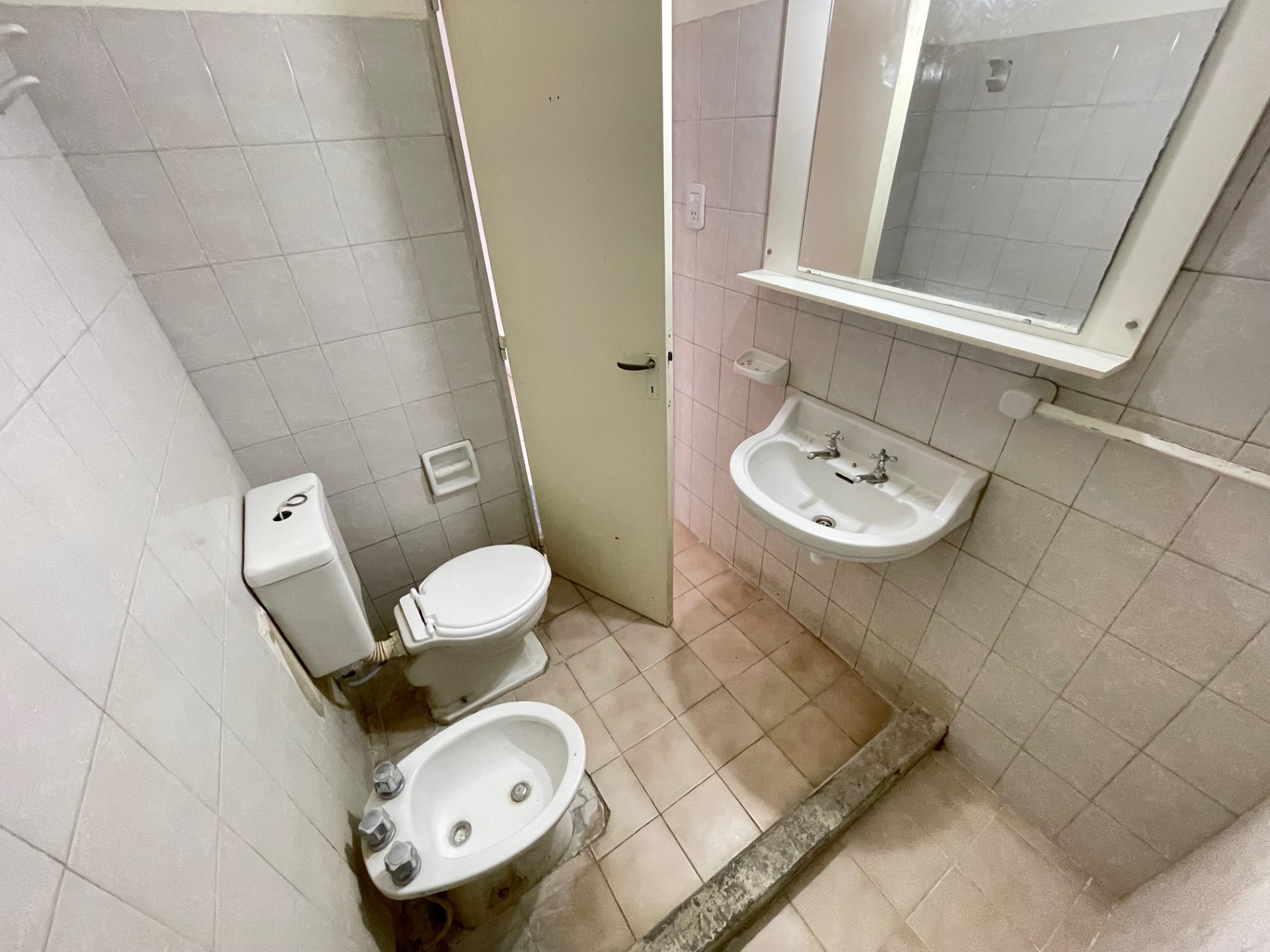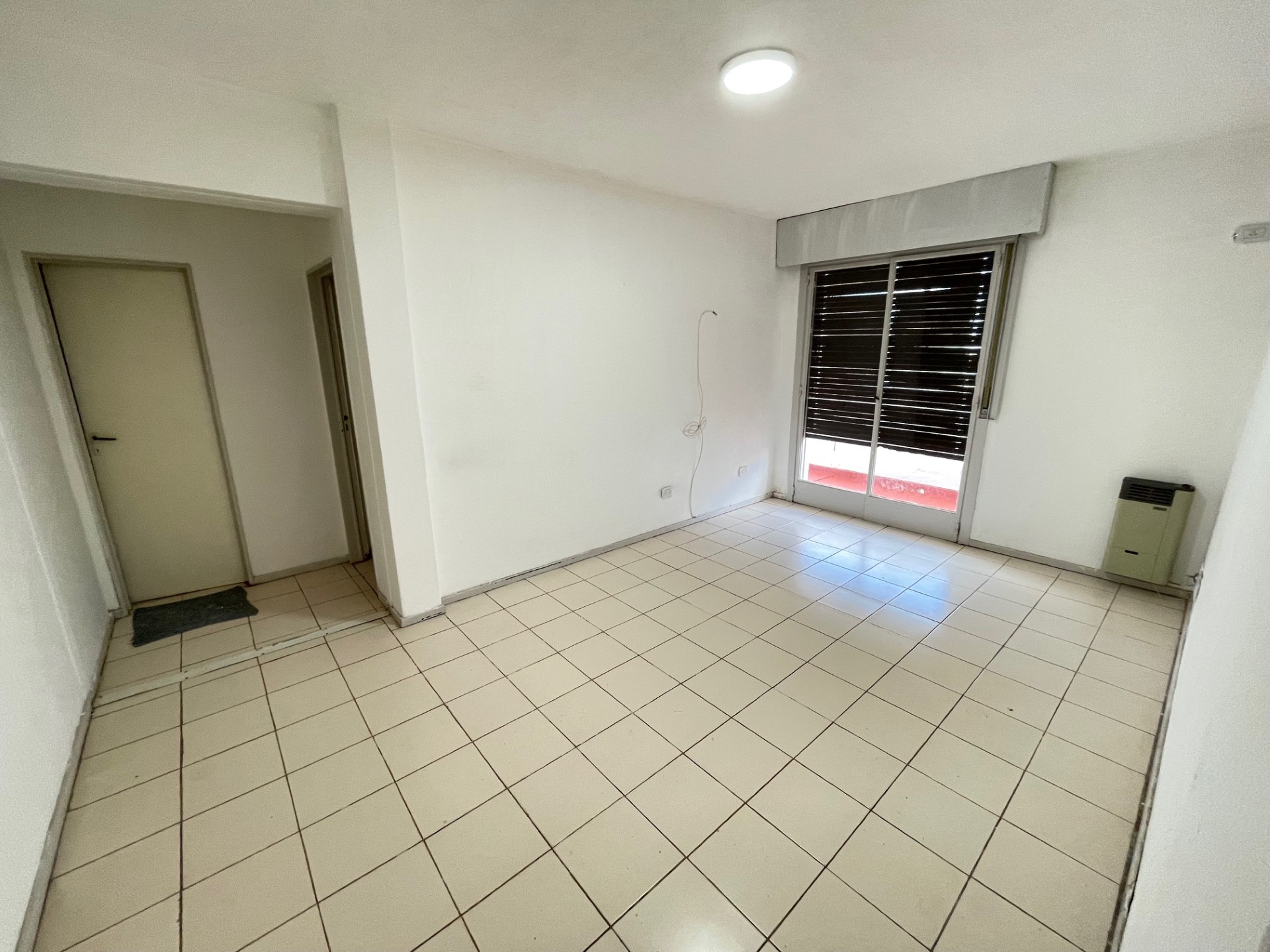 Departamento de un dormitorio y dependencias con balcón completamente cerrado con aberturas de aluminio al frente.