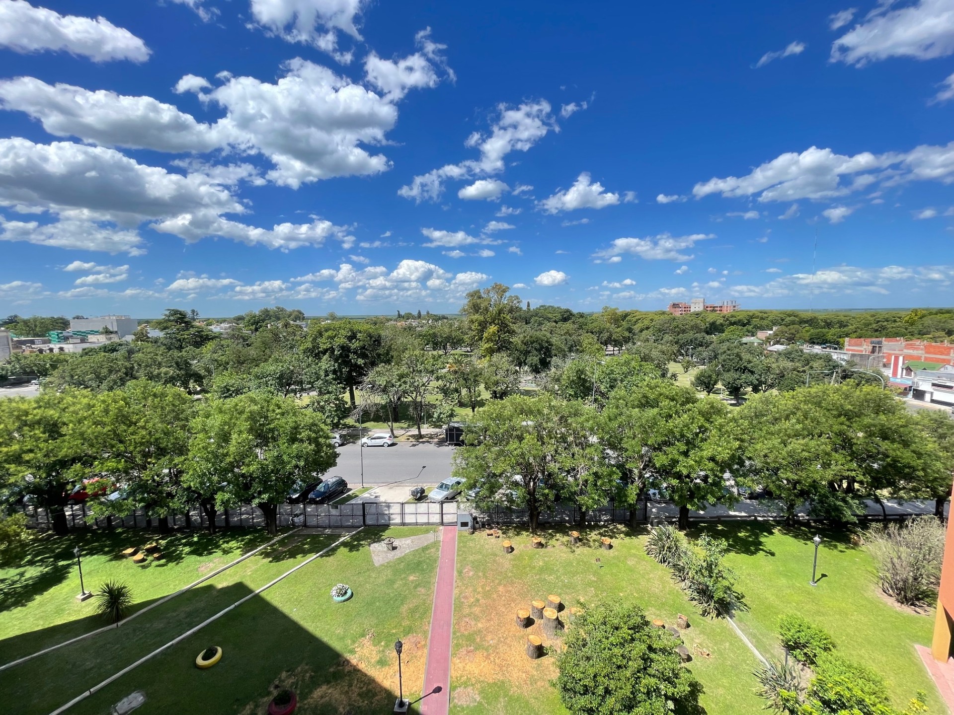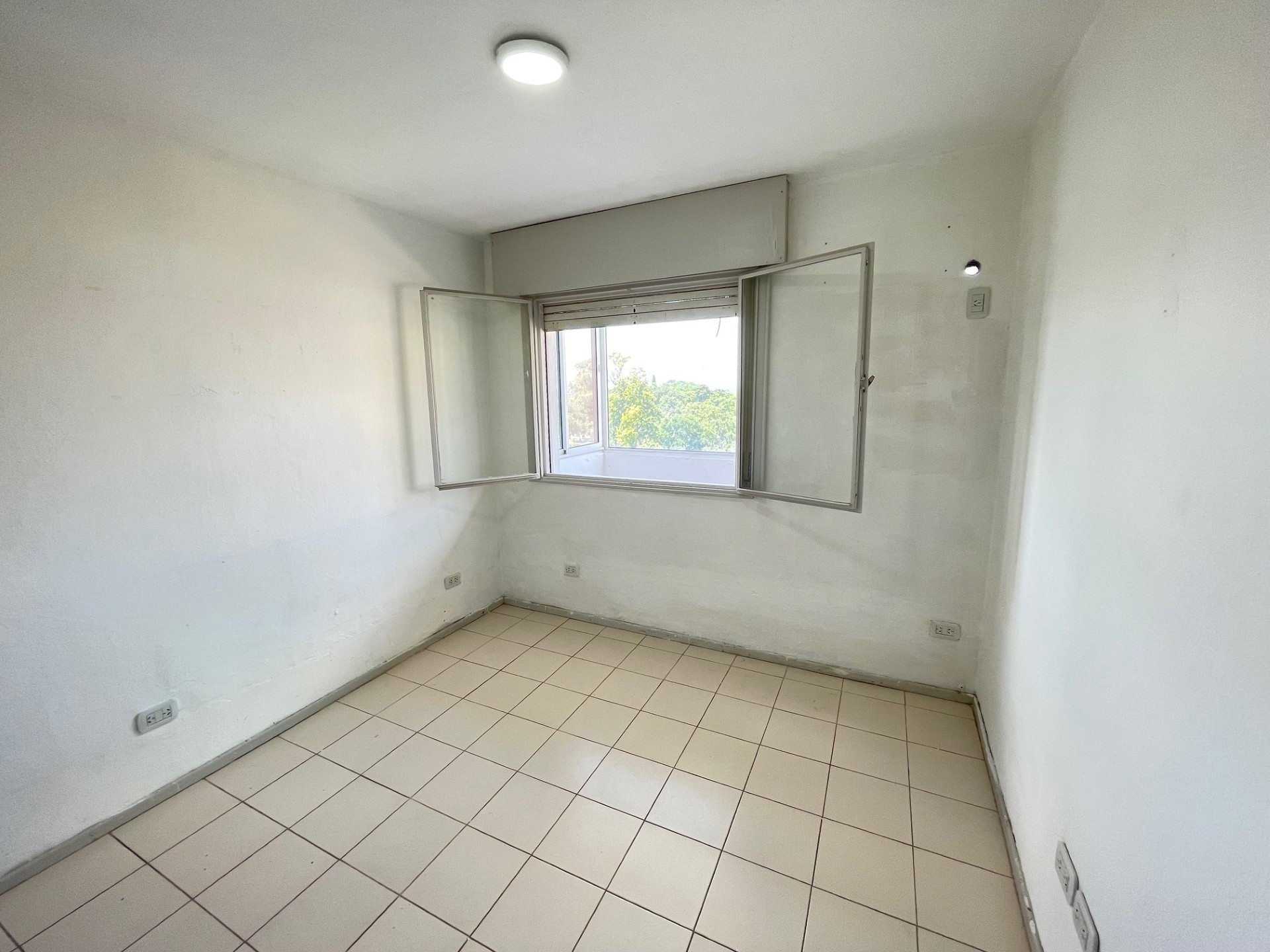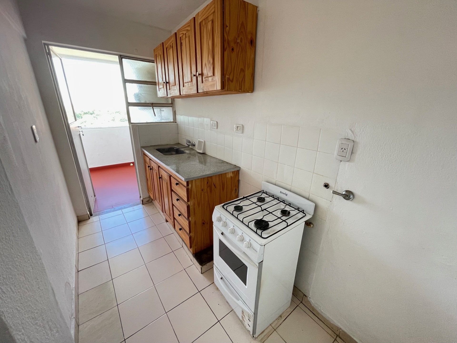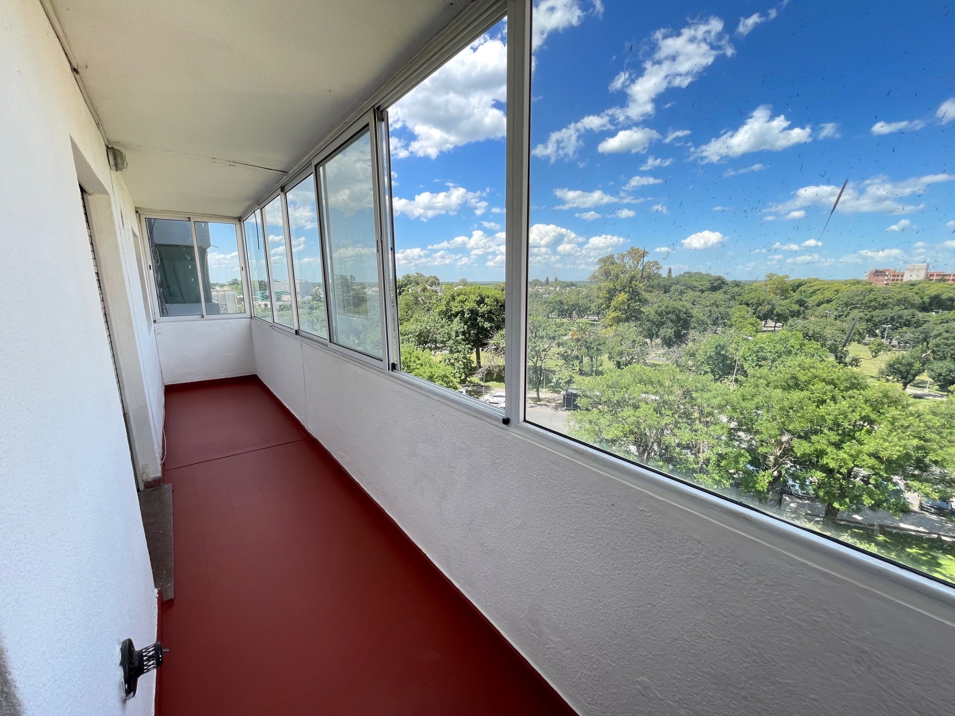 Departamento de un dormitorio y dependencias con balcón completamente cerrado con aberturas de aluminio al frente.