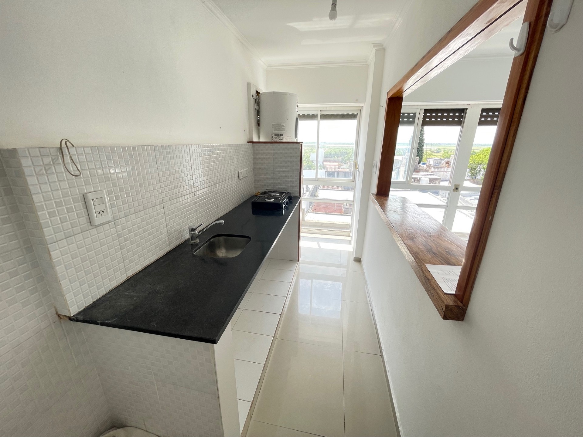 Departamento de un dormitorio amplio, living comedor, cocina separada por una barra, con anafe a gas de dos hornallas y termo eléctrico, baño y cochera cómoda. -